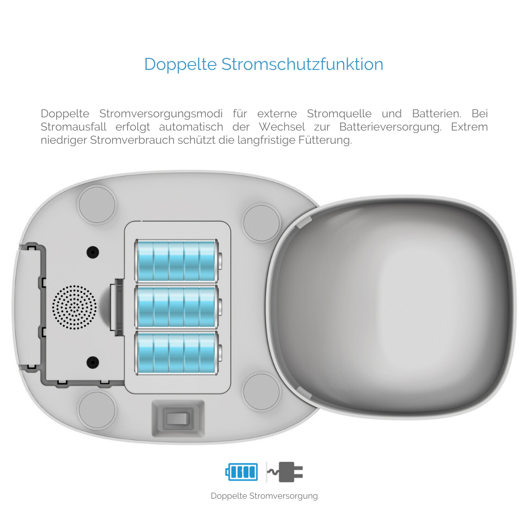 🔋 Dubbele voeding: Met netstroom en batterijvoeding werkt de automaat ook bij stroomuitval, zodat je huisdier geen maaltijd mist.