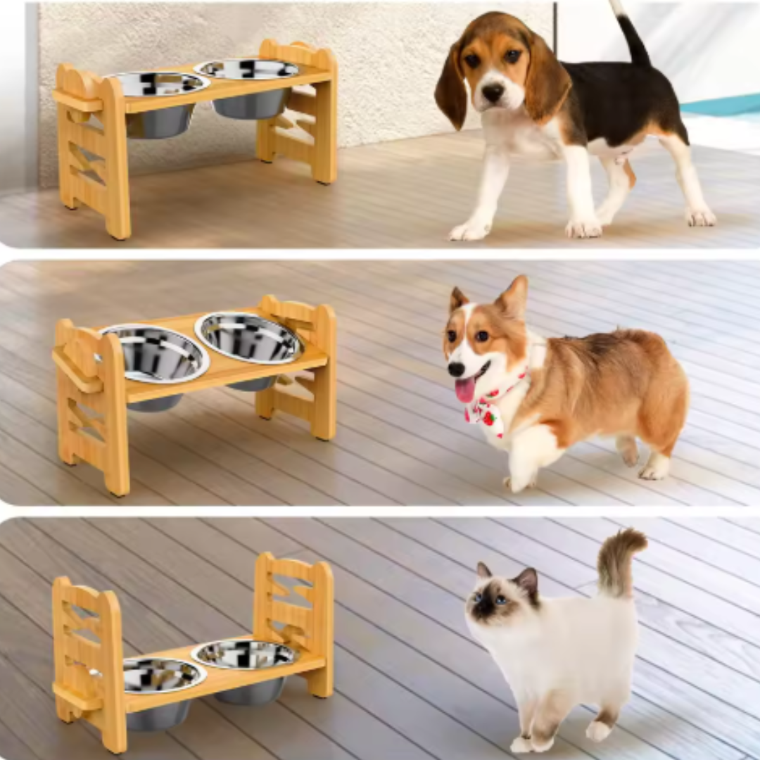 Maak de maaltijden van je huisdier nog beter met onze verhoogde bamboe-borden! Het doordachte ontwerp bevordert een gezonde houding, vermindert de belasting van nek en gewrichten en geeft je huis een stijlvolle, natuurlijke uitstraling. Gemaakt van duurzaam bamboe met robuuste roestvrijstalen borden, is deze set perfect voor honden en katten. Zeg vaarwel tegen chaotische eetplekken en hallo tegen een schone, aangename eetervaring!